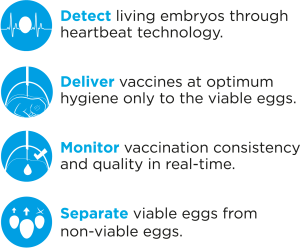 Performing reliable in ovo vaccination, while advancing your hatchery’s operational efficiency is at the core of what we do. Our complete solutions identify viable eggs through heartbeat detection and ensure precise & reliable in ovo vaccination.