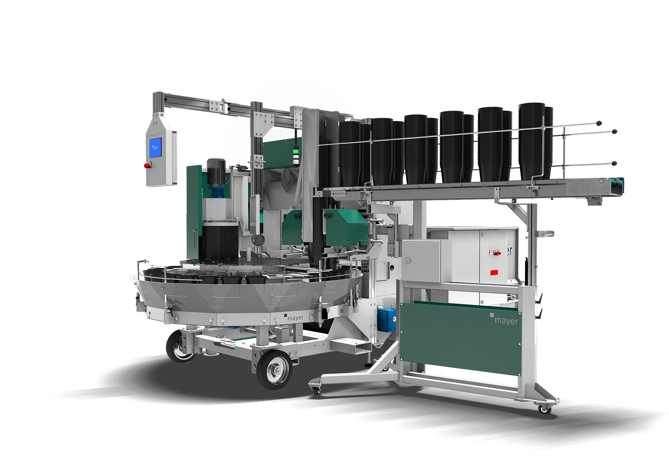 The new TM 2432D impresses above all with its wide range of applications. In double mode, it fills pot sizes 9- 16 cm in diameter with a peak output of up to 5,500 pots per hour. The 14- cycle turntable with 28 pot supports is frequency-controlled and can be adjusted centrally using a ratchet.