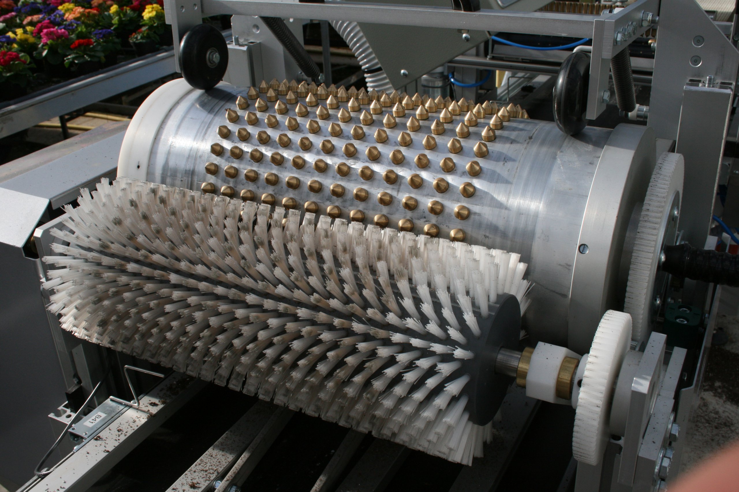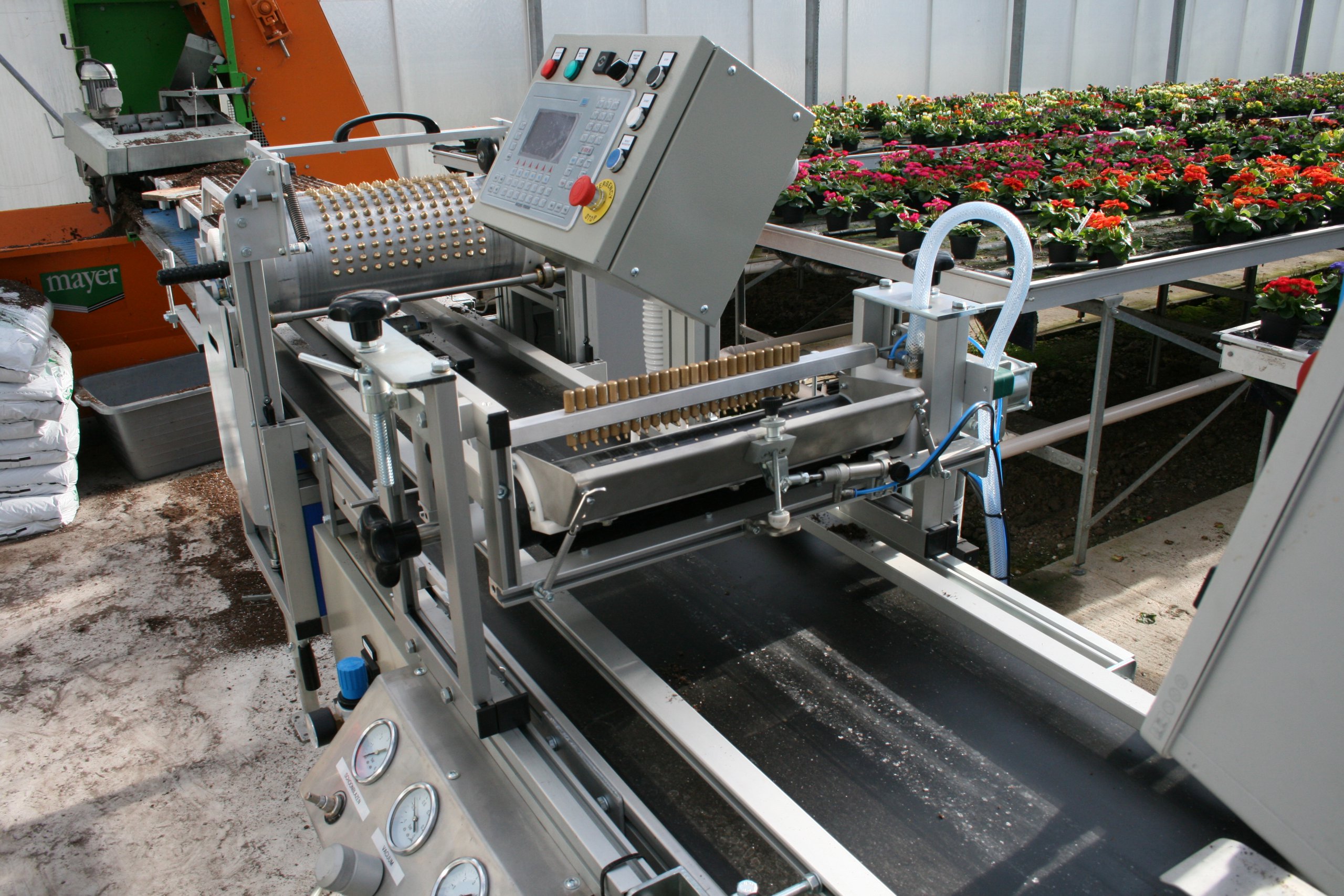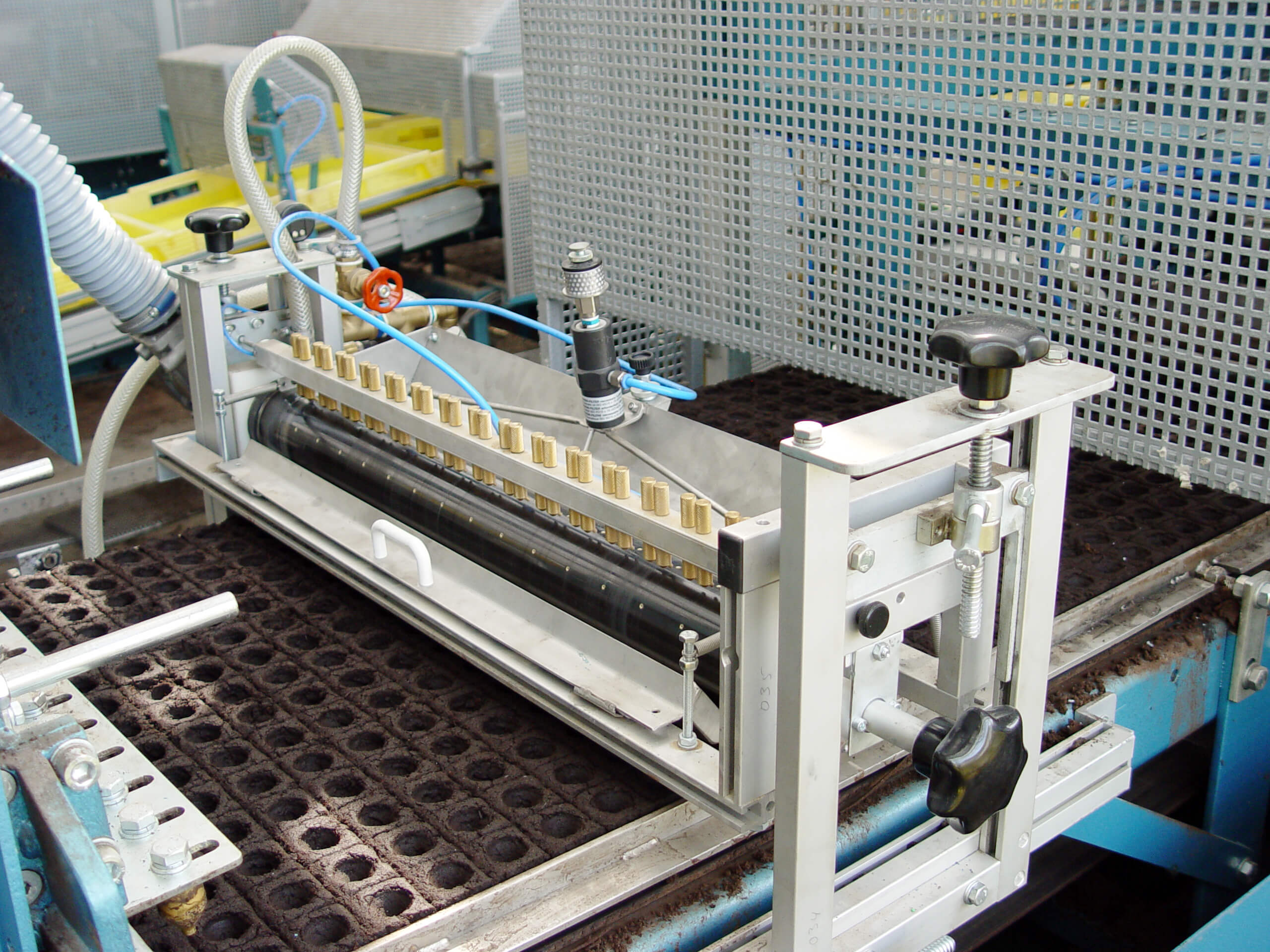 The Auto Seeder Speed Rouline is a fully automatic, high-capacity drum seeder. The servo-controlled sowing drum can be programmed by use of a digital display. The heart of the machine is the rotating seeding drum which holds the seeds by vacuum.