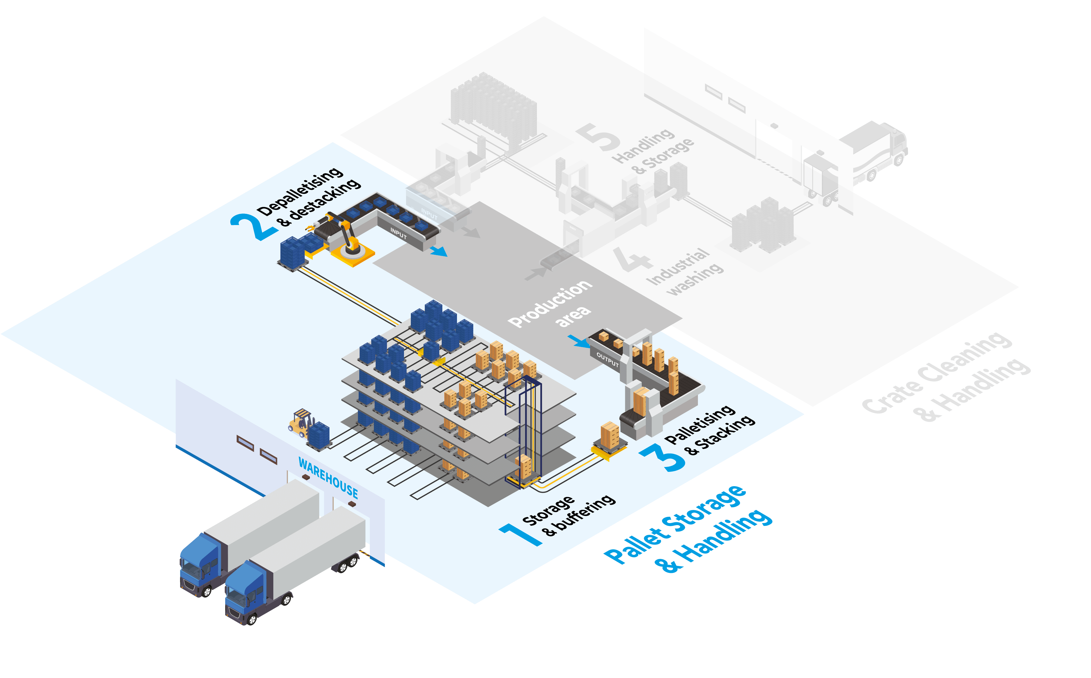 Stores and handles pallets and similar sized products, such as pallet boxes, bins, racks, gitter boxes and tray systems.