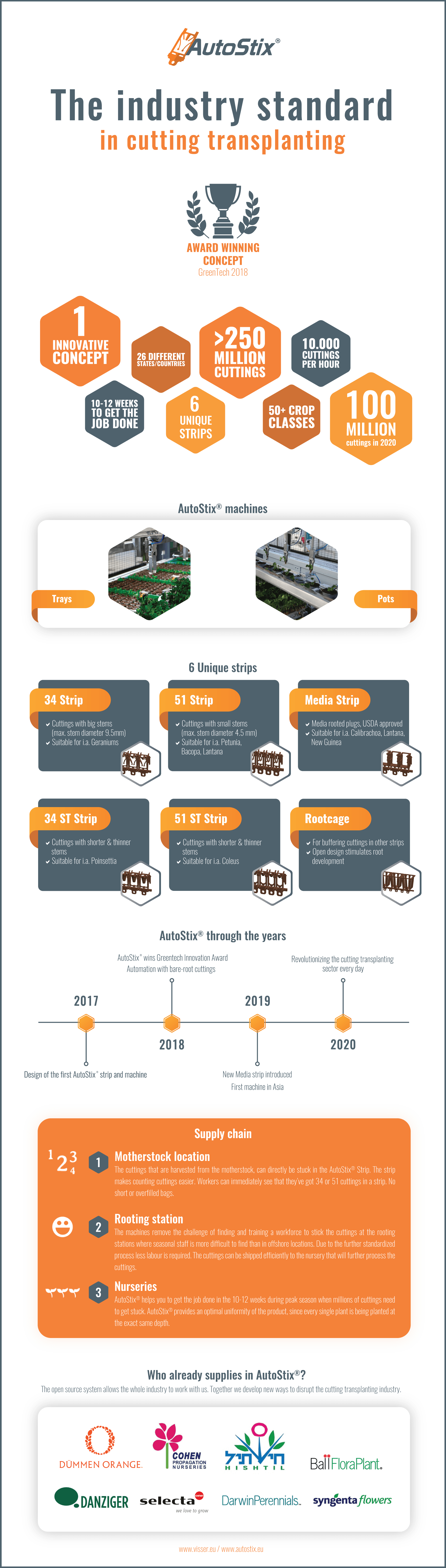 The machine can run different type of strips for different type of plants, only by adjusting the settings on the control panel. The production capacity is up to 10.000 cuttings per hour for the 6 gripper machine. The strip has been designed to enhance and guide the development of the root system and the most beautiful part is that AutoStix® Strips will degrade over time. Besides this, the whole system is open source, which means that anybody can create their own carrier and we invite the whole industry to be part of this. Read more information in the infographic below to decide for yourself if this turnkey concept is indeed the new gamechanger for the sticking of cuttings.